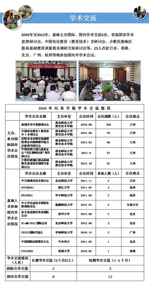 通过选派研究人员国内外访学、参加各类学术会议,邀请国内外本领域高水平专家来中心讲学等方式,加强高层次的对外学术交流,扩大中心的学术影响力。中心将进一步发挥英国上市365教育技术学学科的优势,积极开展全国性,乃至国际性的学术交流活动。定期举办全国性的教育信息化研究论坛,吸引教育相关部门、企事业单位和学术界参加。争取召开一次国际性的学术会议,努力扩大中心的学术影响。