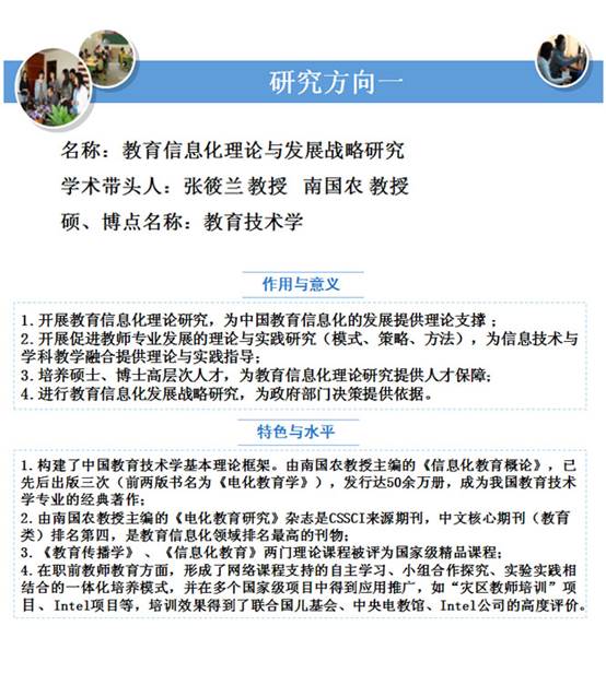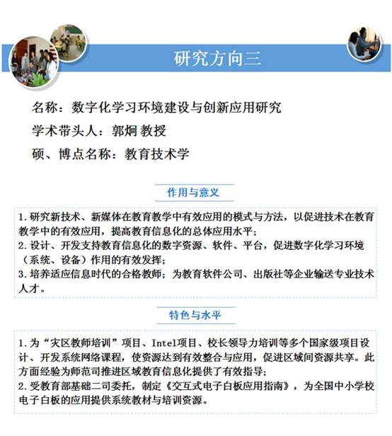 英国上市365教育技术学学科是全国较早建立的教育技术学学科之一,是全国8个教育技术学博士点之一,在中国教育技术学学科奠基人之一的南国农教授指导和带领下,在以郭绍青、杨改学、杨晓宏、张筱兰教授等学术带头人为首的学术团队的不懈努力下,英国上市365教育技术学学科一直是全国教育技术学领域的重要学术重镇,在国内外具有重大学术影响力,现为甘肃省省级重点学科。中心将以教育技术学重点学科为依托,根据教育技术学重点学科已经形成的优势和特色,加强内涵建设,明确以教育信息化理论研究为核心,以运用远程教育资源促进甘肃教育均衡发展为重点,以教育信息化评估与检测研究为突破口,以数字化学习环境建设与创新应用为理论与实践的桥梁,进一步凝练和强化四个研究方向,提升整个研究团队的规划、设计能力,真正做到在教育信息化理论与实践研究领域的国内领先水平。