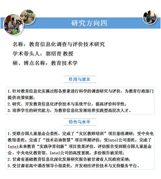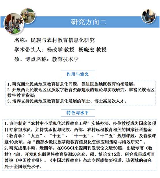 继续关注西部农村、民族地区教育信息化的建设与应用研究,保持这一研究领域在全国的领先地位和学术特色。面向甘肃广大农村和民族地区,利用远程教育资源缩小城乡差距、少数民族地区教育落后等问题,促进教育公平。进一步建设成为民族、农村地区教育信息化研究中心,保持领先地位,争取获得远程教育二级博士点。