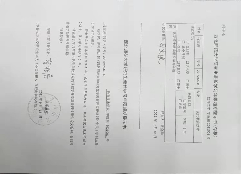 根据《教育部办公厅关于进一步规范和加强研究生培养管理的通知》(教研厅〔2019〕1号)、《英国上市365研究生学籍管理实施细则》(西师发〔2017〕118号)等文件要求,为规范和加强我院研究生学籍管理工作,现将我院2021年秋季学期研究生超期预警工作公示如下。