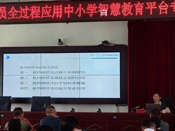 为推动国家中小学智慧平台全域、全流程应用,不断扩大优质资源覆盖面,示范引领教育均衡与教育质量提升,推动国家教育数字化战略行动,助力甘肃省智慧教育建设,8月21日,学院教师常咏梅教授、房立博士应邀参加由定西市教育局主办、渭源县教育局承办的“全域全员全过程应用中小学智慧教育平台专题培训会”,对现场67位中小学校长、骨干教师开展“国家中小学智慧教育平台应用”专项培训。甘教数字化、定西微教育、渭源县教育局等多个平台同步直播,累计2万多名教师在线参加。
