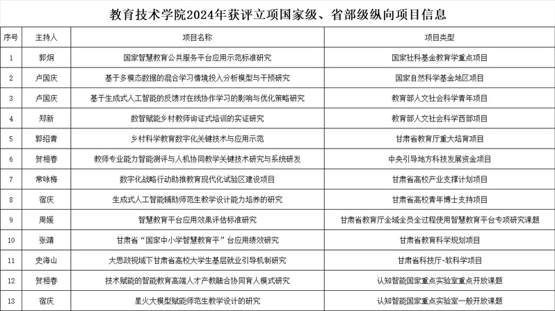 郭炯教授主持的“国家智慧教育公共服务平台应用示范标准研究”项目,获批国家社科教育学“重点”项目,实现在重大重点科研项目上的新突破。青年教师卢国庆先后获批国家自然科学基金地区项目、教育部人文社会科学青年项目等2项国家级课题项目。
