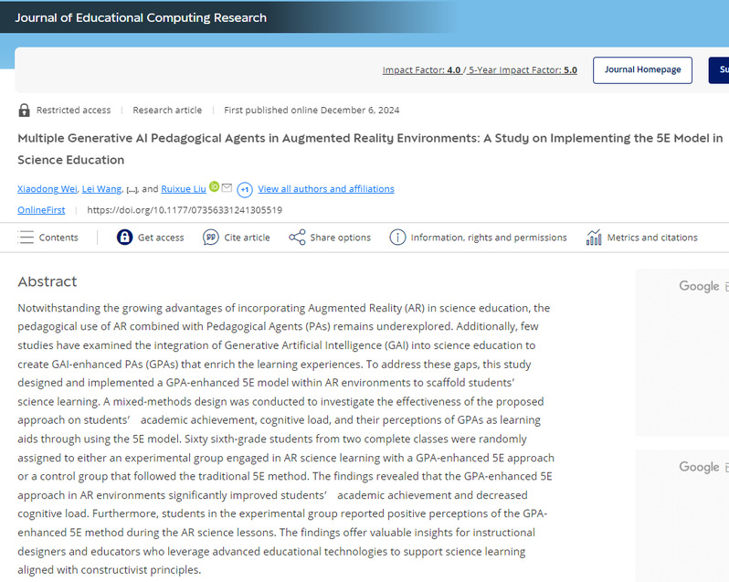 近日,我院魏小东教授以第一作者的身份在国际期刊《Journal of Educational Computing Research》(JCR一区,中科院二区)上发表了一篇题为《Multiple Generative AI Pedagogical Agents in Augmented Reality Environments: A Study on Implementing the 5E Model in Science Education》的高水平学术论文。该论文创新性地在增强现实(AR)环境中融入生成式人工智能(GAI)支持的教学代理(GPAs),并利用5E教学模型为学生的科学课程学习提供支持。研究采用混合方法设计,系统探讨了5E模型结合GPAs作为学习辅助工具对学生学业成绩、认知负荷及其对GPAs态度的影响。研究结果表明,该方法能够显著提升学业成绩并降低认知负荷。