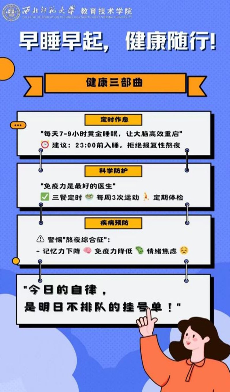 学院开展了“早睡早起,健康随行”主题倡议活动。志愿者通过线上线下相结合的方式普及健康睡眠知识,养成健康生活方式,号召同学们“放下手机、拥抱清晨”。