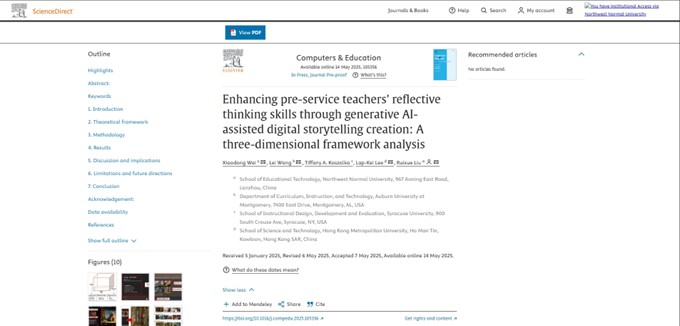 近日,我院魏小东教授以第一作者的身份在国际SSCI、SCI双检索教育学一区TOP顶刊(影响因子8.9)《Computers & Education》上发表了一篇题为《Enhancing pre-service teachers' reflective thinking skills through generative AI-assisted digital storytelling creation: A three dimensional framework analysis》的高水平学术论文。该论文本基于三维反思框架,探索了生成式人工智能(GAI)对职前教师在数字故事创作中的反思性思维技能的影响。研究发现,GAI工具有助于促进职前教师数字故事设计过程中更深入地思考问题定义与解决方案,提升对自我、作品与情境的反思频率,并增强单环、双环及三环等多层次的反思能力。