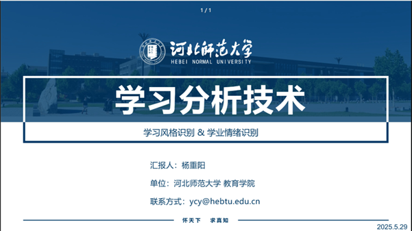 5月29日晚,学院邀请河北师范大学杨重阳博士在线作题为“学习分析技术:学习风格与学业情绪识别”的学术讲座。学院部分教师、全体硕博士研究生参与了讲座,讲座由学院郭婉瑢博士主持。