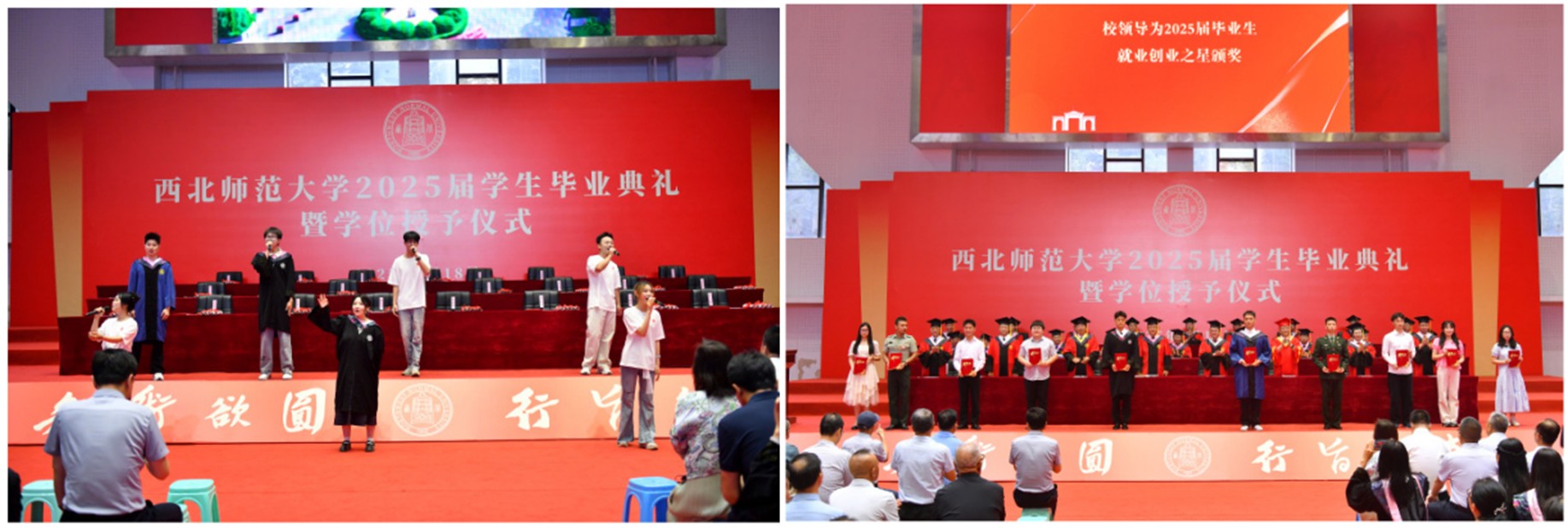 毕业典礼上,校领导为获得2025年“就业创业之星”的学生颁奖。学院2025届硕士毕业生谢阳腾同学荣获 “就业创业之星” 称号。谢阳腾同学在校期间积极投身创新创业项目,用八年时光深耕校园创业,打造出极具影响力的非官方自媒体“小白超用心”,创办甘肃小白超有爱网络科技有限公司。