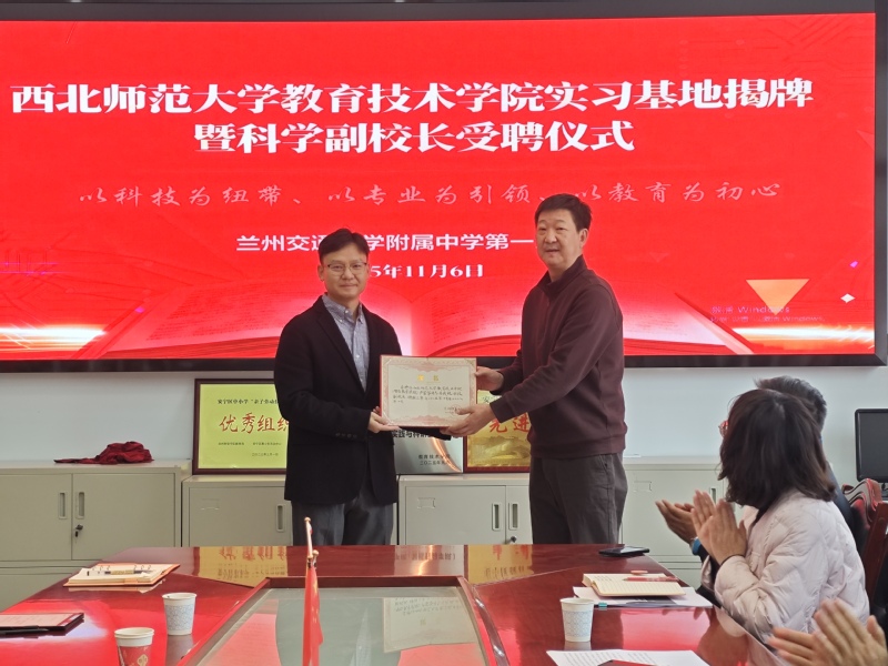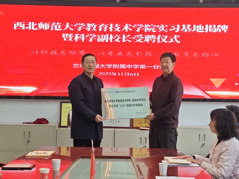 杨志龙在致辞中回顾了学校与西北师大的深厚渊源,并指出,教育实习是师范生成长的关键环节,学校将全力保障实习工作,全面开放课堂、教研与管理环节,为师范生提供优良的实践环境与生活支持。随后,刘波与杨志龙共同为“英国365公司(智能教育学院)学生教育‘三习’实践与科研基地”揭牌,并向受聘为四十四中科学副校长的严富华颁发聘书,这标志着双方在教师教育实践与科学教育协同方面迈出坚实一步,也将助力学校人工智能素养能力的整体提升。