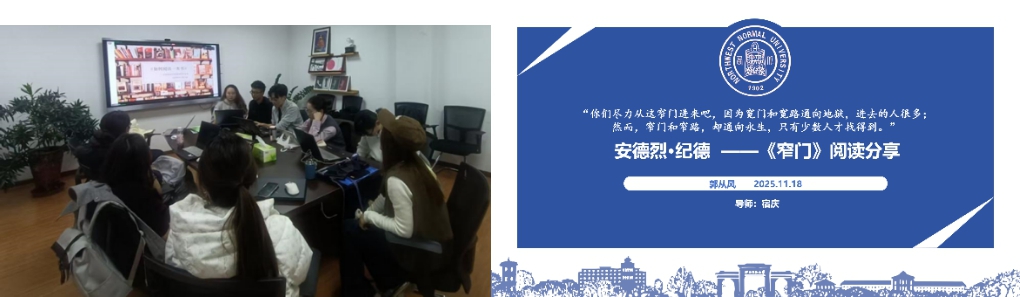 宿庆导师团队以文学经典为切入点,线上分享法国作家纪德的《窄门》。解析作品中宗教信仰与个人自由的冲突,探讨“窄门”意象的象征意义,宿庆老师鼓励学生在学术研究中挣脱陈旧观念,在文学阅读中涵养思辨能力与人文情怀。