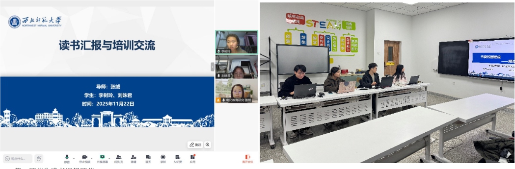 张绒导师团队通过线上会议开展“阅读汇报+技能培训”双环节活动。学生分享《如何阅读一本书》的系统化阅读规则与《教育科学研究方法》的核心要点,详解批判性阅读与主题阅读技巧,同步开展英文论文写作、教育智能体搭建培训,张绒老师强调阅读需与课题研究紧密结合,推动知识向实践工具转化。