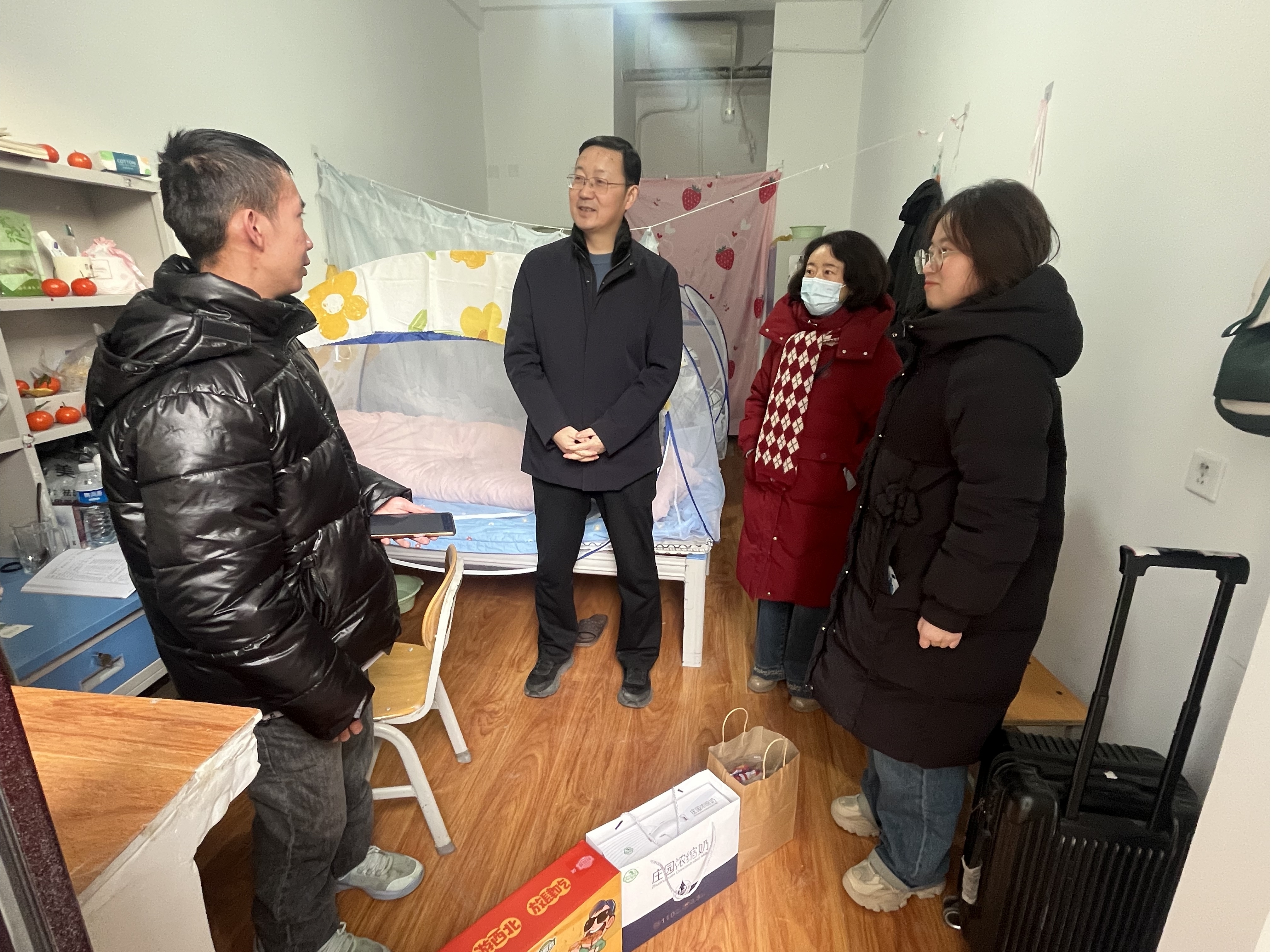 2025年12月18日,学院开展家校共育走访活动,学院党委书记刘波、副书记毕向宏及辅导员深入学生公寓,关怀们同学在校学习生活状况。